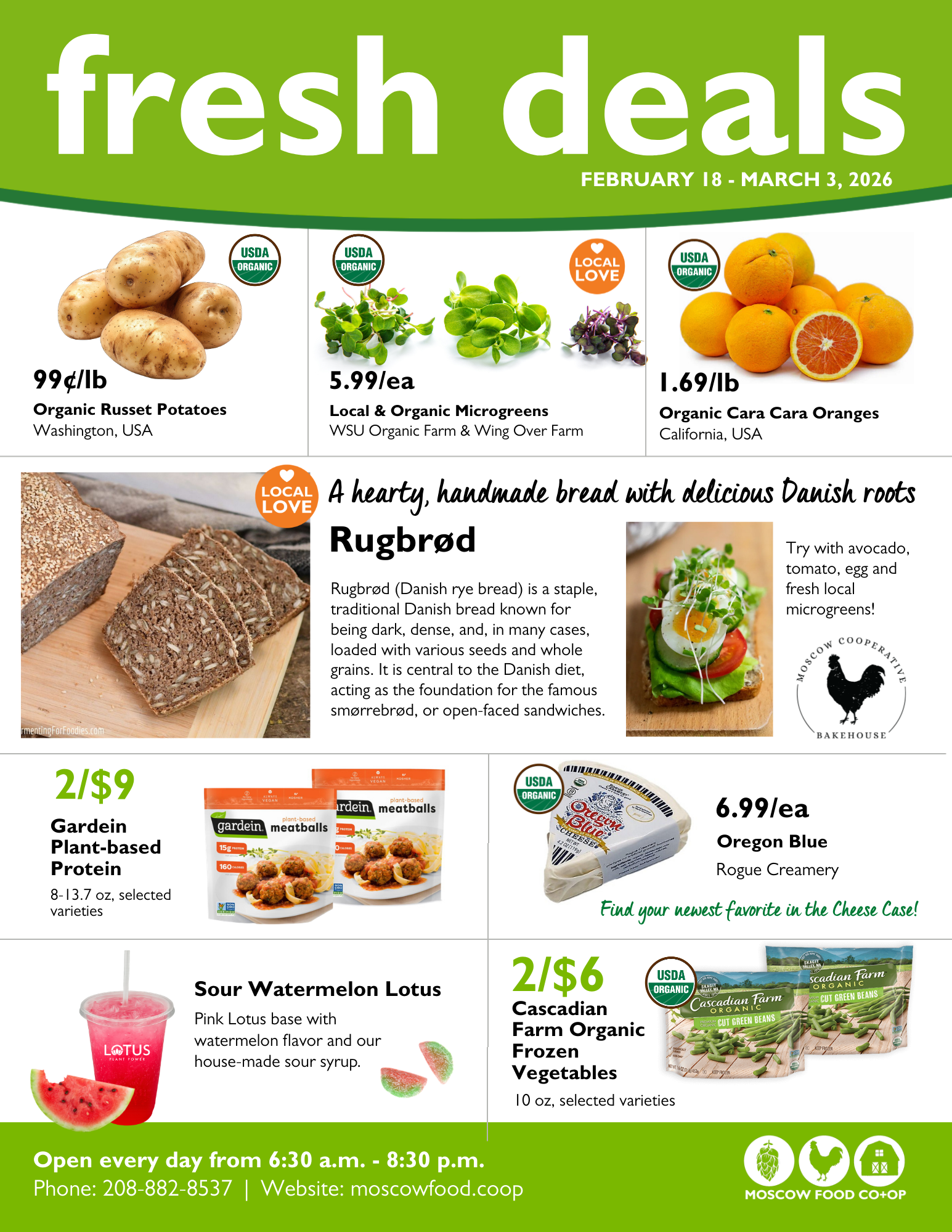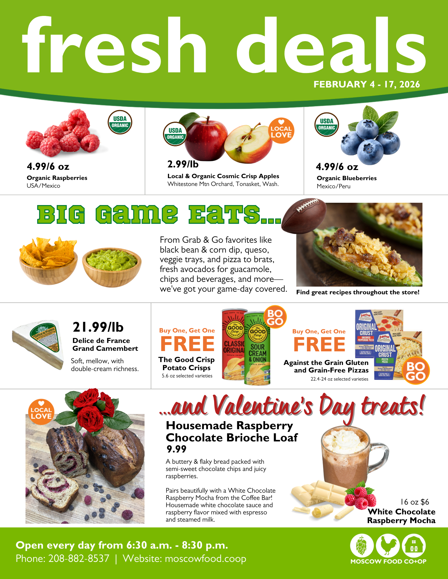Since 1973, the Moscow Food Co-op has been more than a grocery store — we’ve been a community hub rooted in good food and local values. Owned by thousands of our neighbors, the Co-op exists to support local farmers and producers, champion sustainability and make healthy, natural foods accessible to all.